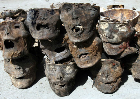 Skulls are seen in this March 29, 2006 file photo taken in Tianzhu County, northwestern China's Gansu province. Police Wednesday confirmed that 121 skulls found in the western part of Northwest China's Gansu Province were human and had been hacked from their bodies after death. [newsphoto]