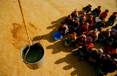 Chinese children wait to collect drinking water from a water tanker at a remote village in Minxian County, Northwest China's Gansu Province, in this file photo taken on April 2005. China is facing a serious water crisis -- 300 million people do not have access to drinkable water.[Newsphoto/file]