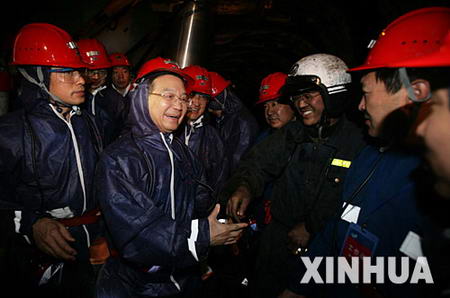 Front) talks with workers underground in the Shangwan Coal Mine of Shenhua