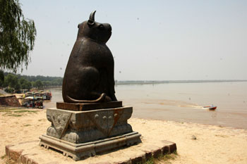 A iron sculpture of rhinoceros located at Huayuankou of Zhengzhou, capital of central China's Henan Province expressed ancient people's wishes for a clean Yellow River. Huayuankou is the beginning of the lower reaches of Yellow River. This photo was taken on June 1, 2006. [newsphoto]