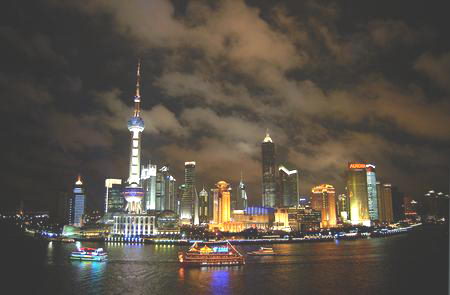 The sky is illuminated as the landscape lights underwent the final adjustment in Lujiazui of Pudong District in Shanghia on the Tuesday evening, June 13, 2006. The large-scale landscape lights were in place to hail the upcoming 2006 SCO summit meeting. [China Foto Press] |