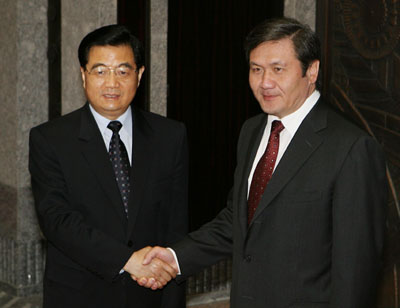 China's President Hu Jintao (L) greets Mongolian President Nambaryn Enkhbayar before their bilateral meeting at the Xijiao State Guest House in Shanghai June 16, 2006. [Reuters] |