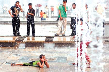 Northwest China's Shannxi Province, play under a fountain yesterday after