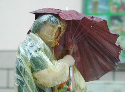 A resident manages to walk against strong winds in the rain in Taizhou, Zhejiang Province July 14, 2006. Typhoon Billis is approaching China's east coast, bringing heavy rains and strong winds. [newsphoto]
