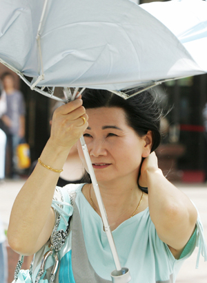 A woman holds on to her umbrella amid strong winds brought by tropical storm Kaemi in Taipei, Taiwan July 25, 2006. [Reuters]