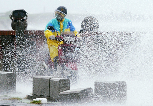 A man rides as waves pound on southern port city of Kaohsiung in Taiwan during strong winds from typhoon Kaemi July 25, 2006. [Reuters]