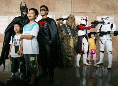 movies 'Star Wars' and 'Batman' pose during the Ani-com Hong Kong, an animation