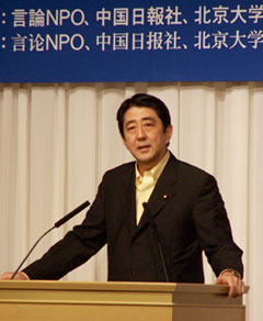 Japanese Chief Cabinet Secretary Shinzo Abe speaks at the Tokyo-Beijing Forum sponsored by China Daily, Peking University and the Japanese think tank Genron NPO in Tokyo August 3, 2006. [chinadaily.com.cn]