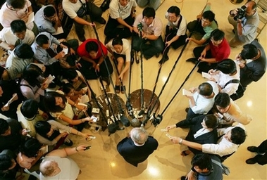 Christopher Hill, bottom center, speaks to journalists in Beijing