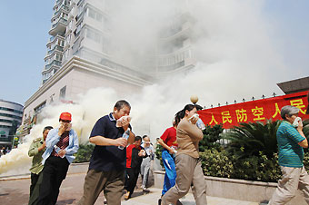 evacuate during an air defence drill in Hangzhou, Zhejiang Province on