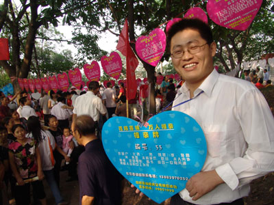 A man holds a board with his details, such as age, height, education and job prospects on it during a match-making session at a park in Yongchuan, Southwest China's Chongqing municipality September 23, 2006. The oldest participant of the event is 80 years old while the youngest 21. [Newsphoto]