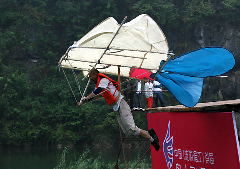 A participant compete at China Birdman Contest 2006 in Lianyuan, Central China's Hunan Province on October 7. Nearly 50 birdmen participated in the nationwide games. [newsphoto]
