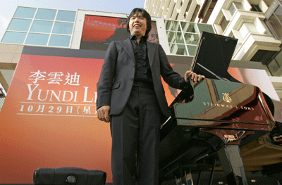 Painist Li Yundi of China stands after a short performance at a shopping mall in Hong Kong October 29, 2006. [Reuters]