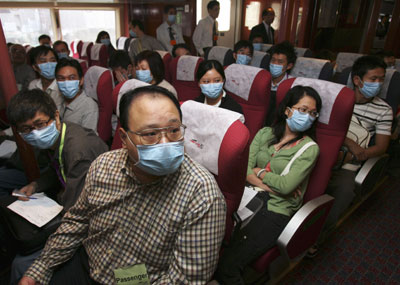 Participants acting as passengers wear masks as part of a precautionary drill on a ferry in Hong Kong November 1, 2006. [Reuters]