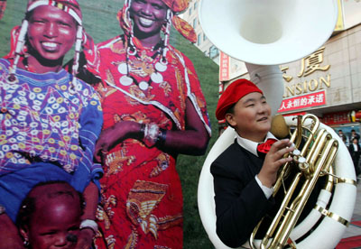 front of a billboard in downtown Beijing promoting the Summit of the Forum