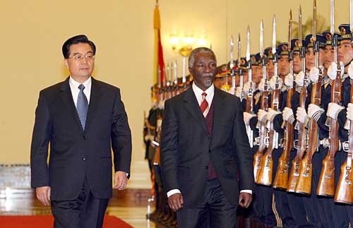 Bilateral relations have maintained all-round and rapid development since China and South Africa established diplomatic ties nine years ago, Hu said during talks with Mbeki Monday morning in the Great Hall of the People in central Beijing. "The two sides have established strategic partnership and our cooperation has been fruitful in politics, trade and economy, science and technology, culture, education, tourism and human resources," he said, adding that the two countries have also collaborated closely in major regional and international issues. The two presidents reached extensive consensus on enhancing their countries' long-term and stable strategic partnership on the basis of equality, mutual benefits and common development. "It serves the fundamental interests of the two countries and peoples. It is conducive to world peace and development, too," he said. Hu made four proposals to that effect. "Firstly, we should enhance political trust and strategic consultation; maintain the momentum of high-level contacts; fully exploit the roles of bilateral exchange mechanism and promote all-round reciprocal cooperation," he said. Secondly, Hu proposed the two countries to take their respective advantages and bring trade and economic cooperation to a new level. "We should encourage and support two-way investment, optimize trade structure and ensure the sound and smooth development of bilateral trade," he said. Thirdly, China and Africa need to carry out diplomatic consultation and enhance coordination and collaboration. "The Chinese side supports South Africa's efforts in promoting unity and cooperation among the developing countries," Hu said. "We are willing to enhance communication and exchanges with South Africa, intensify coordination and collaboration on the UN affairs and work together to maintain the legitimate rights and interests of the developing countries." Fourthly, Hu proposed the two countries increase personnel and cultural
