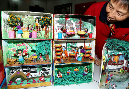 One of the neighbours of Mrs. Wang admires her creation of craftworks depicting the Suzhou folk scenes in her home in Suzhou, east China's Jiangsu Province November 28. Wang, a retired teacher, made the fifteen craftworks in a month with waste materials such as milk box and rags. [Xinhua]