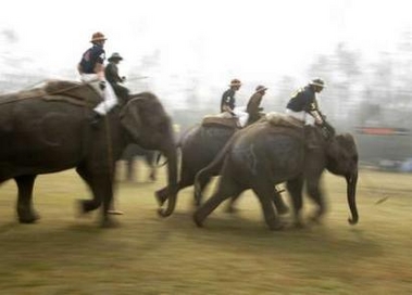 Chopard Hong Kong and British Gorkhas compete for the ball during the semi-finals of the World Elephant Polo competition at Meghuli Forest in south Nepal November 30, 2006. The Hong Kong team beat the Gorkhas 4-3 in a sudden death shoot-out. [Reuters]