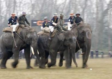 Chopard Hong Kong and British Gorkhas compete for the ball during the semi-finals of the World Elephant Polo competition at Meghuli Forest in south Nepal November 30, 2006. The Hong Kong team beat the Gorkhas 4-3 in a sudden death shoot-out.[Reuters]