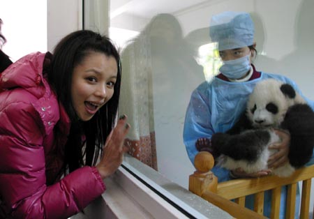 Taiwan singer-actress Vivian Hsu (L) watches a panda cub she supports through the window of a breeding room at the Chengdu Research Base of Giant Panda Breeding in southwest China's Sichuan Province December 10. Vivian took a close encounter with fans and giant pandas at the breeding centre. [newsphoto]