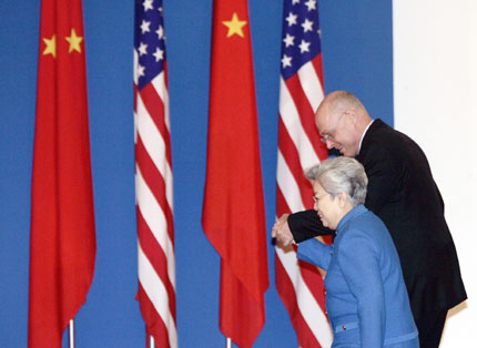 China's Vice-Premier Wu Yi hold hands as they arrive for a joint news