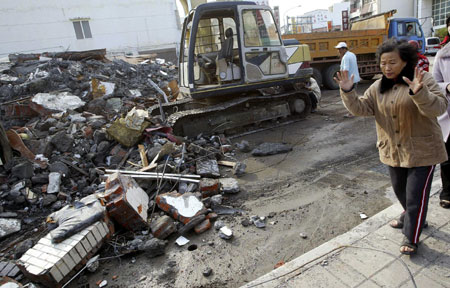 A resident looks around her collapsed house after a strong earthquake shook Taiwan of China on Tuesday in southern Pingtung county December 27, 2006. Two people were killed and 42 injured when three buildings collapsed in earthquakes that shook southern Taiwan Province. [Reuters]