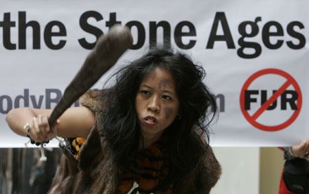 An animal protection activist from People for the Ethical Treatment of Animals (PETA) dressed as a prehistoric caveperson protests against the use of fur outside a Burberry boutique in Hong Kong January 16, 2007. [Reuters] ![]()