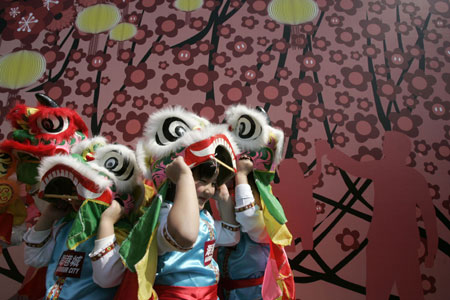 Children prepare to perform a lion dance during a promotional event to welcome the Year of the Pig for the upcoming Chinese New Year, at a shopping mall in Hong Kong January 30, 2007.[Reuters]