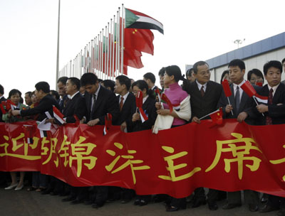 president Hu Jintao at Khartoum airport in Sudan February 2, 2007. Hu pledged a