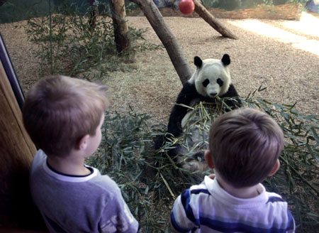 Giant panda mother Lun Lun eats a meal of bamboo as zoo guests watch her on the day her cub Mei Lan made her debut to the public at Zoo Atlanta in Atlanta, Georgia February 22, 2007. [Reuters]