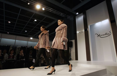 Models present creations at a booth during the Hong Kong International Fur and Fashion Fair in Hong Kong February 26, 2007. [Reuters]