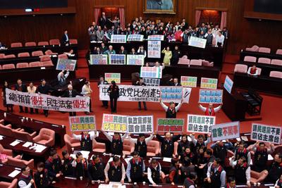 Legislators hold slogans during a scuffle between Democratic Progressive Party and Nationalist Party members at Taiwan's "Legislative Yuan" in Taipei March 8, 2007. [phoenixtv.com]