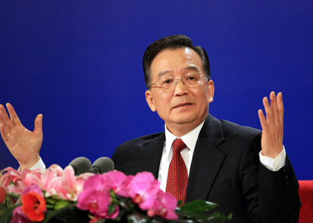 Premier Wen Jiabao waves to the media after Friday's closing ceremony