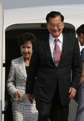 Honorary Chairman and his wife Lien Fangyu (L) step off a plane upon their