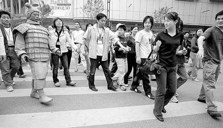 A performance artist dressed as the terracotta warrior attracts big audience on a street in Shanghai, May 6, 2007. [eastday.com]