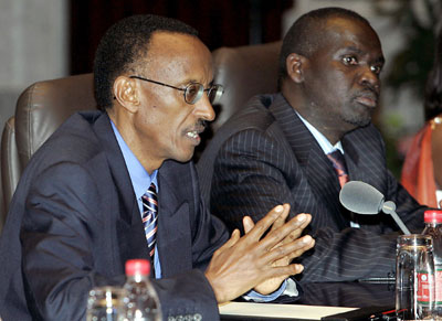 Rwanda's President Paul Kagame (L) speaks during a bilateral meeting with Chinese Premier Wen Jiabao in Shanghai May 15, 2007. [Reuters] |