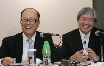 Hong Kong tycoon and Hutchison Whampoa Chairman Li Ka-shing (L) smiles with group managing director Canning Fok during a news conference following an annual general meeting in Hong Kong May 17, 2007. [Reuters]