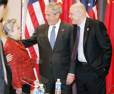 Paulson (R) welcome Chinese Vice Premier Wu Yi to the Eisenhower Executive