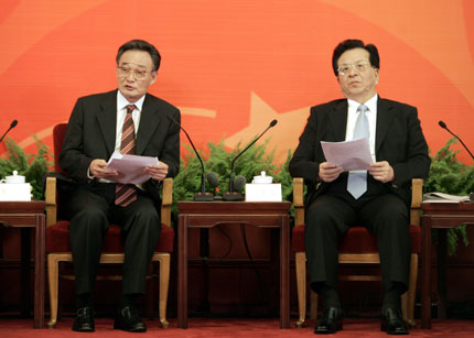 Seminar marking 10-year-old HK Basic Law(Reuters)Updated: 2007-06-06 12:38 ![]() Chairman of the Standing Committee of China's National People's Congress Wu Bangguo (L) delivers a speech as China's Vice President Zeng Qinghong listens during the seminar marking the 10th anniversary of the entry into force of the Hong Kong Basic Law at the Great Hall of the People in Beijing June 6, 2007. [Reuters]