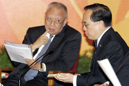 Seminar marking 10-year-old HK Basic Law(Reuters)Updated: 2007-06-06 12:38 ![]() Hong Kong's Chief Executive Donald Tsang (R) speaks as former Chief Executive Tung Chee-hwa looks at him during the seminar marking the 10th anniversary of the entry into force of the Hong Kong Basic Law at the Great Hall of the People in Beijing June 6, 2007. [Reuters]