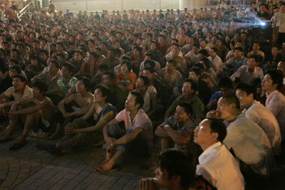 Hundreds of migrant workers watch an open-air movie near a construction site in Beijing June 6, 2007. [Reuters]