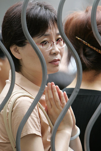 A mother prays behind a school gate as her child takes the national college entrance exams in Shanghai June 7, 2007. Starting Thursday, a record 10 million Chinese youngsters will sit for the two-day National College Entrance Exam this year, vying for about half that number of university places. [Reuters] |