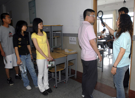 An invigilator uses a metal detector to check students as they step into the test room before the national college entrance exam in Changchun, Northeast China's Jilin Province, June 7, 2007. [Xinhua]
