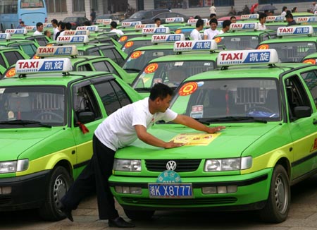 A taxi driver puts up a sign onto the car as he prepares to offer free drive for students to test spots of the national college entrance exam in Loudi, South China's Hunan Province, June 6, 2007. Starting Thursday, a record 10 million Chinese youngsters will sit for the two-day annual exam this year, vying for about half that number of university places. [newsphoto] |