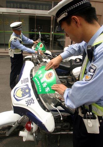 Policemen puts up signs onto motorcycles as they prepare to serve exam-takers for emergency in Jinan, East China's Shandong Province, June 6, 2007. Starting Thursday, a record 10 million Chinese youngsters will sit for the two-day annual exam this year, vying for about half that number of university places. [newsphoto] |