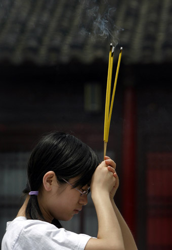 A student prays for her upcoming national college entrance examination at a temple in Nanjing, east China's Jiangsu province June 6, 2007. This year, a record 10 million Chinese youngsters will sit for the two-day National College Entrance Exam, starting on Thursday, vying for about half that number of university places. [Reuters] |