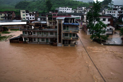 Residential houses are submerged as a deluge hits Lianzhou, South China's Guangdong Province June 7, 2007. Continuous floods have inundated roads, houses, farmland and schools and had some 300 students stranded. The rescue work is under way. [Xinhua]