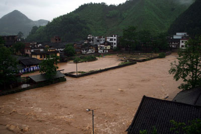 Residential houses are submerged as a deluge hits Lianzhou, South China's Guangdong Province June 7, 2007. Continuous floods have inundated roads, houses, farmland and schools and had some 300 students stranded. The rescue work is under way. [Xinhua]