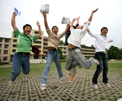 Five students jump for fun after they finish the two-day national college entrance exams, or Gaokao, on a high school campus in Miaoshui county, South China's Guangxi Zhuang Autonomous Region June 8, 2007. [Xinhua]