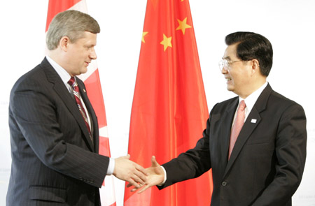 Canadian Prime Minister Stephen Harper (L) reaches